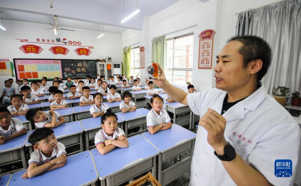 6月5日,河北省邢臺市南和區(qū)人民醫(yī)院醫(yī)務(wù)人員深入鄉(xiāng)村開展基層義診活動,為賈宋鎮(zhèn)蘇史張村小朋友講解眼睛的結(jié)構(gòu)和功能。新華社發(fā)(張馳 攝)