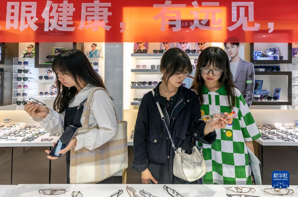6月5日,學(xué)生在貴州省黔西市一家眼鏡店內(nèi)選配眼鏡。新華社發(fā)(范暉 攝)