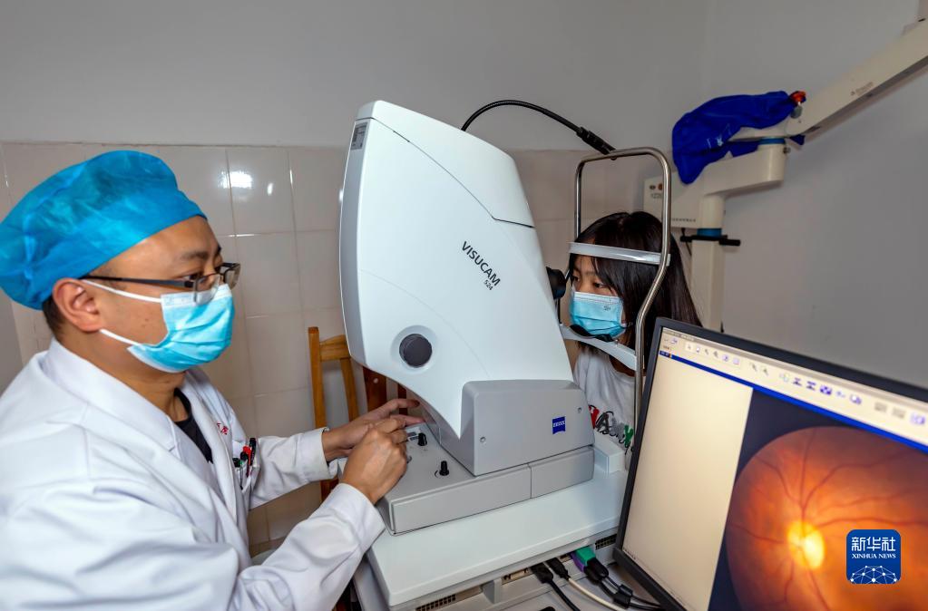 6月5日,湖南省常寧市第三人民醫(yī)院的醫(yī)護(hù)人員在為小朋友進(jìn)行眼部檢查。新華社發(fā)(周秀魚春 攝)