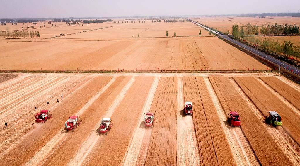 6月2日,收割機在臨沂市郯城縣郯城街道的麥田里收獲小麥。新華社記者郭緒雷 攝