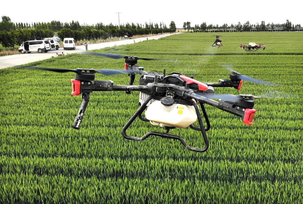 裝機、灌藥、起飛,幾架直徑一米左右的無人機在技術(shù)人員操控下盤旋爬升、空中懸停、勻速前行,霧化藥肥混合劑均勻地灑在麥苗上,僅用1分鐘就完成了1畝農(nóng)田的植保任務(wù)。