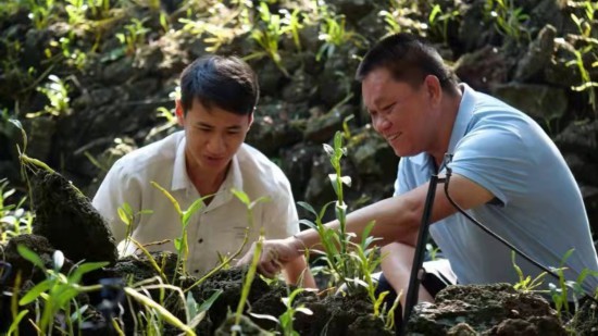 施茶村黨委書記洪義乾(右)查看火山石斛長勢。受訪者供圖