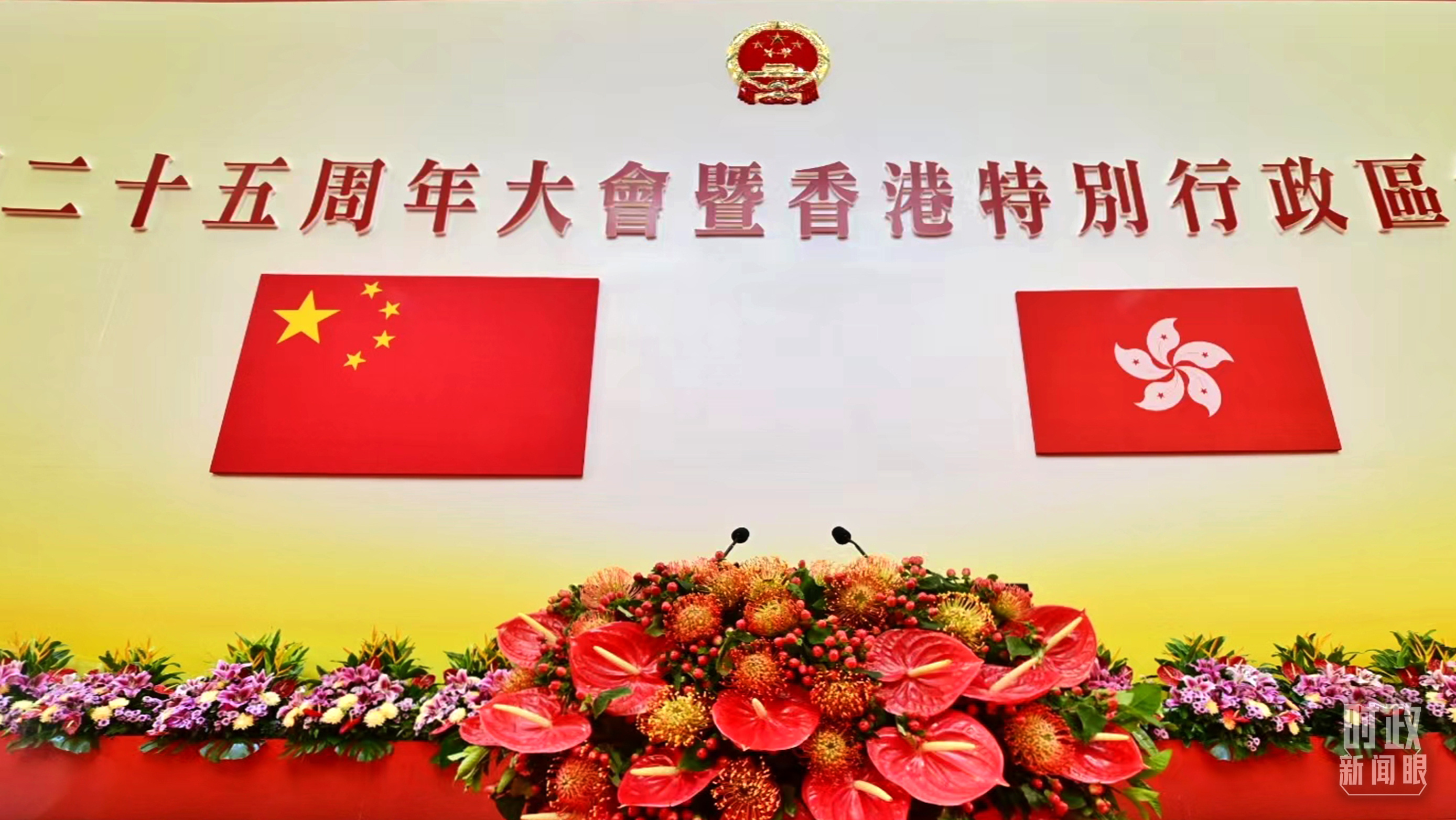 △這是慶祝大會暨就職典禮開始前的現(xiàn)場。香港特區(qū)2021年10月8日正式刊憲生效的《國旗及國徽(修訂)條例》列明,行政長官、主要官員、司法、行政會議、立法會和區(qū)議會宣誓儀式須展示國旗和國徽。(總臺央視記者王志明拍攝)