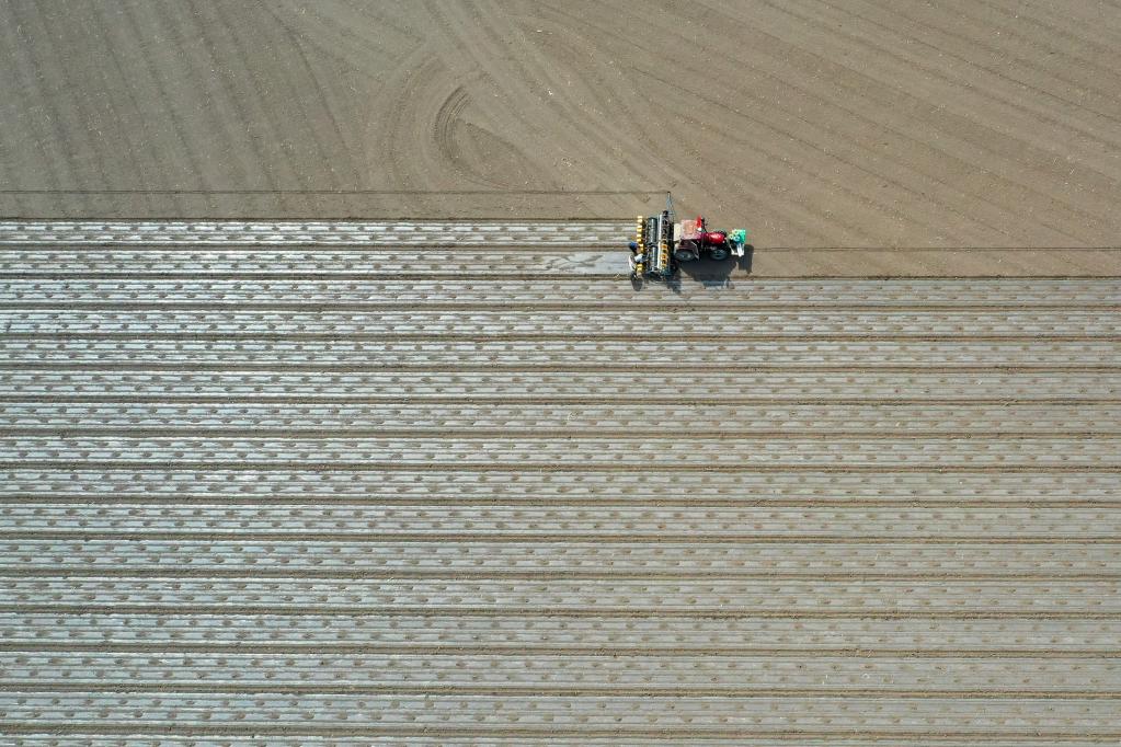2022年4月19日,在新疆生產(chǎn)建設(shè)兵團(tuán)第六師共青團(tuán)農(nóng)場,搭載北斗導(dǎo)航系統(tǒng)的播種機(jī)在棉田作業(yè)。新華社記者 丁磊 攝
