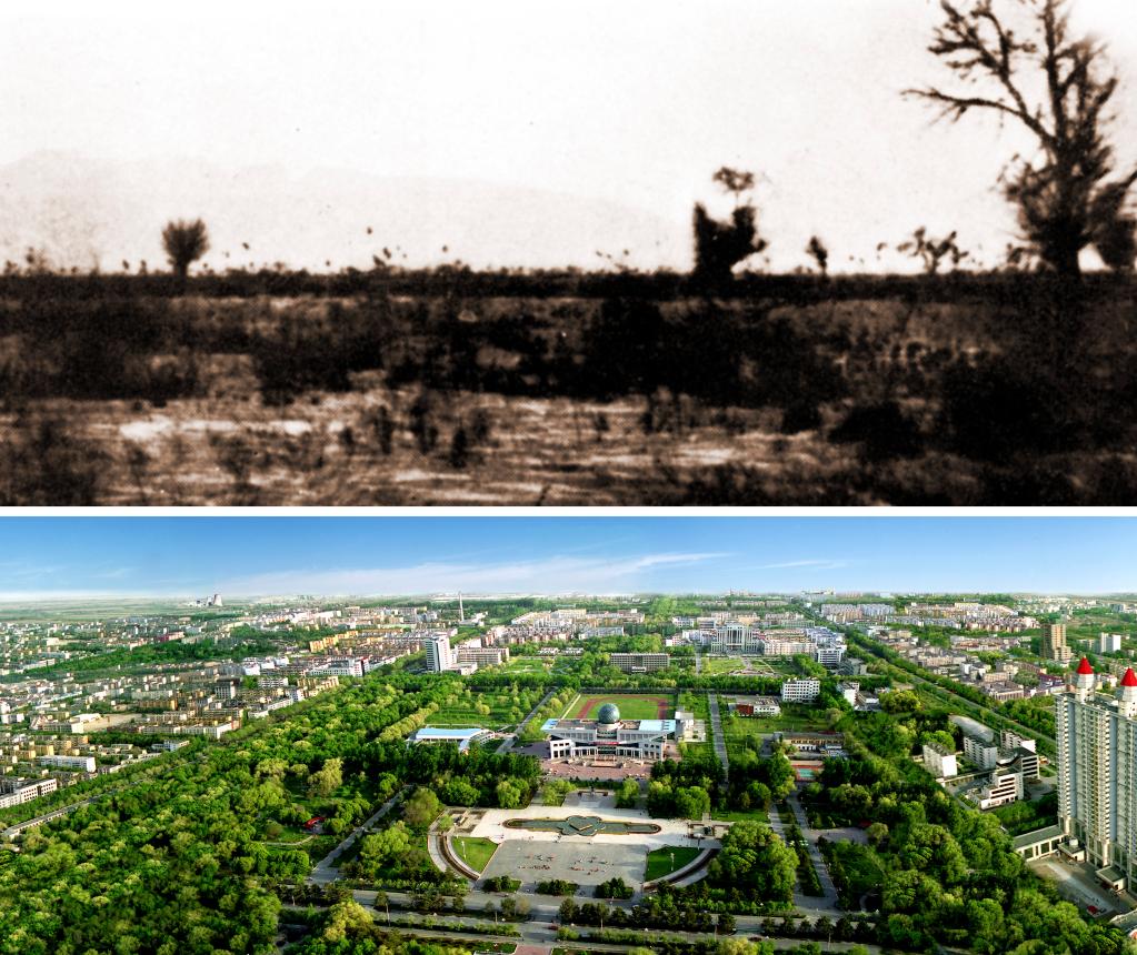 上圖為20世紀(jì)50年代,石河子開發(fā)前的面貌(新疆兵團(tuán)軍墾博物館提供);下圖為石河子夏日美景(新疆生產(chǎn)建設(shè)兵團(tuán)第八師宣傳部提供)。新華社發(fā)