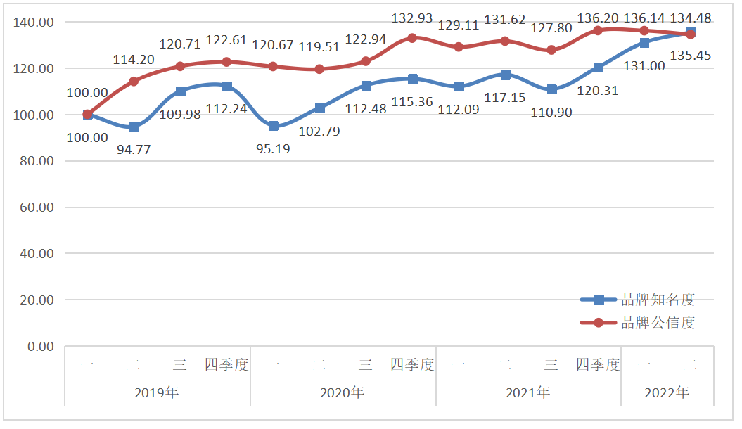 西鳳酒品牌傳播力指數(shù)2022年二季度運行監(jiān)測顯示,西鳳酒品牌傳播力略有提升,達(dá)到134.96點。通過節(jié)日宣傳、交流拜訪、基酒項目建設(shè)等活動,西鳳酒品牌知名度和品牌公信度分別達(dá)到135.45點和134.48點。
