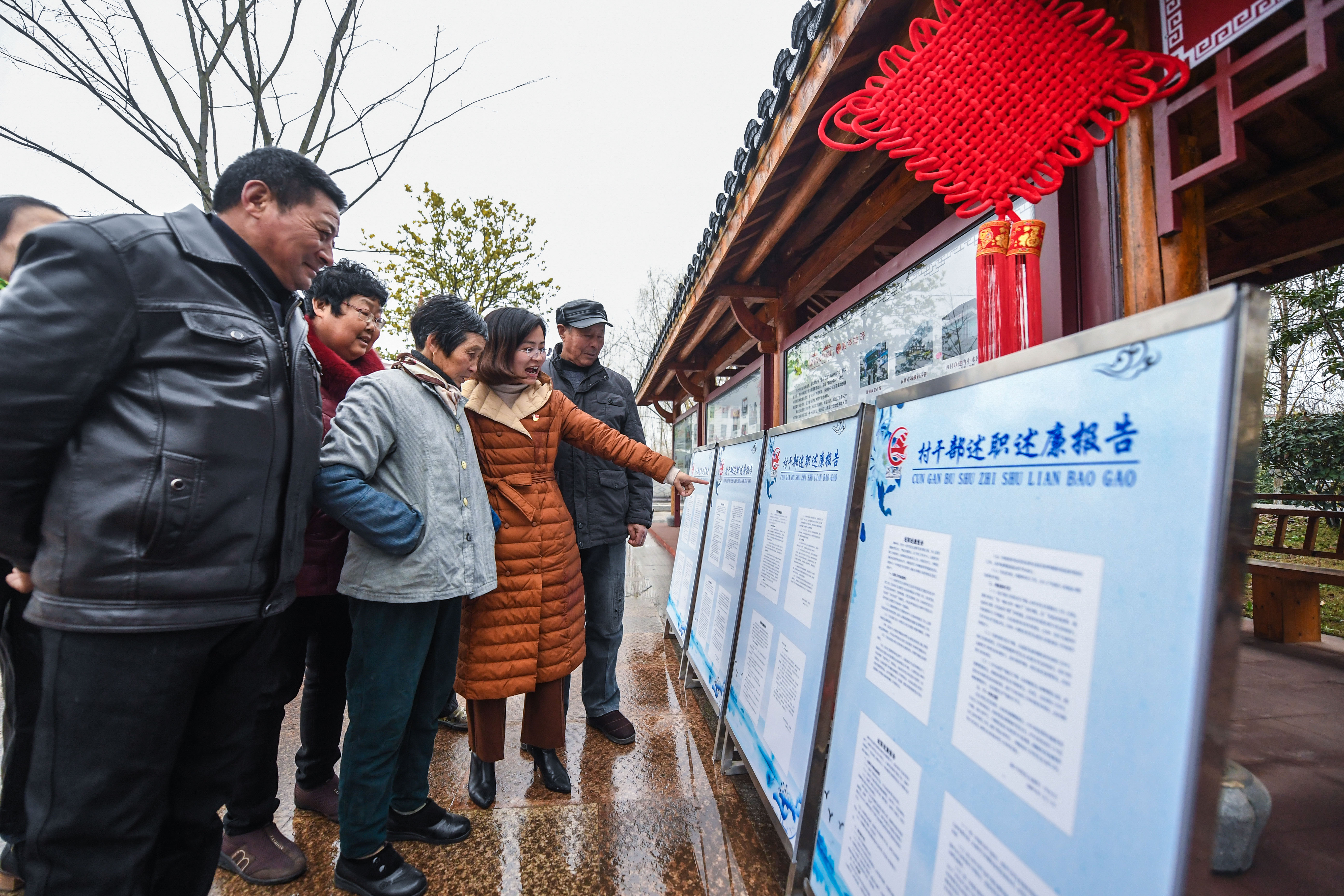 2019年1月15日,浙江省長興縣虹星橋鎮(zhèn)港口村黨總支委員(右二)向村民介紹2018年度村干部述職述廉情況,接受村民監(jiān)督。新華社記者 徐昱 攝