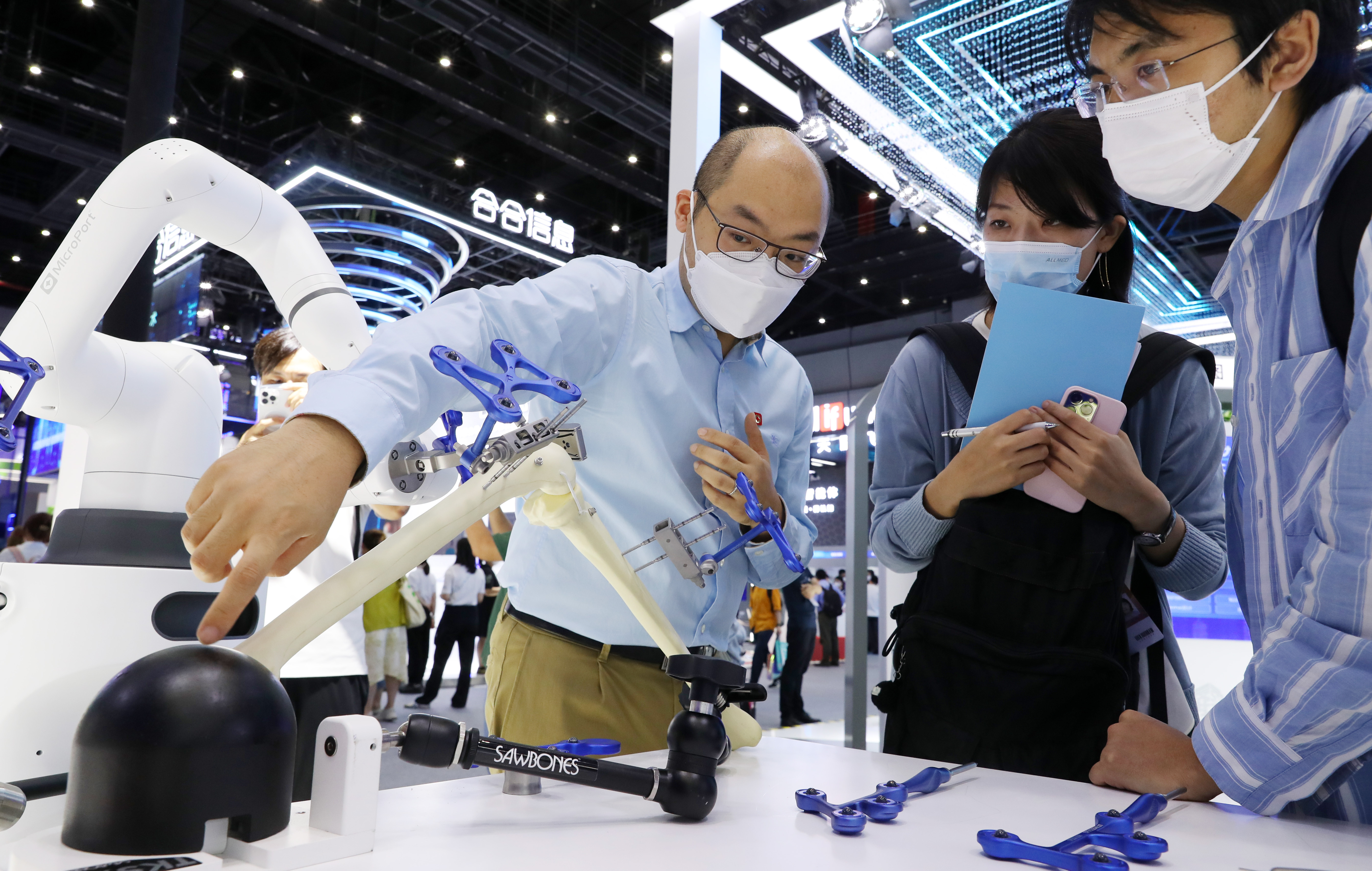 2022年9月1日,工作人員(左一)向參觀者介紹微創(chuàng)骨科手術(shù)機器人。當日,2022世界人工智能大會在上海世博中心拉開帷幕。新華社記者 方喆 攝