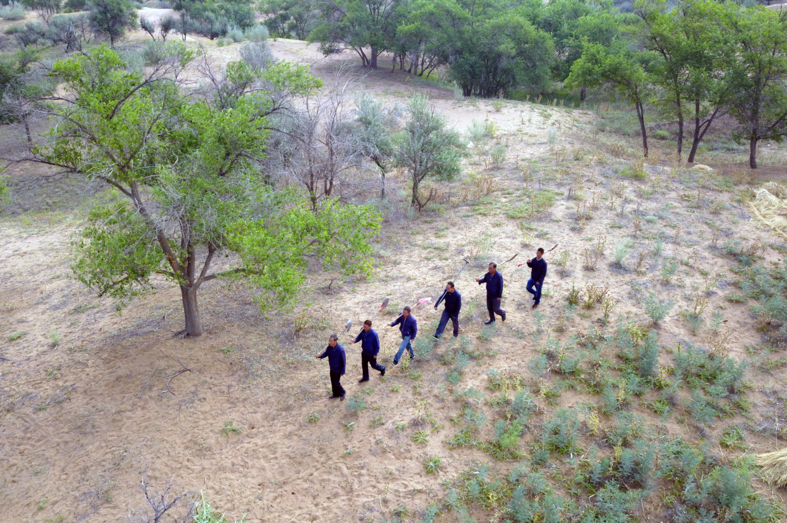 在甘肅省武威市古浪縣八步沙林場,場長郭萬剛(左一)和大家一起前往治沙點(2019年8月23日攝,無人機照片)。新華社記者 范培珅 攝