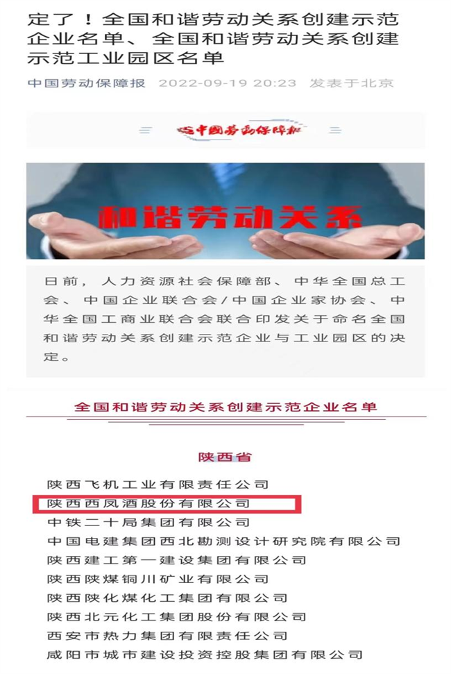 西部決策網(wǎng)訊(記者艾米杰 韓宗憲 通訊員 許凡 張?zhí)炝ⅲ闃淞⑹痉兜湫?、弘揚人文關懷、傳遞和諧溫暖,進一步推動廣大企業(yè)深入開展和諧勞動關系創(chuàng)建活動,促進構建中國特色和諧勞動關系。近日,人力資源和社會保障部、中華全國總工會、中國企業(yè)聯(lián)合會/中國企業(yè)家協(xié)會、中華全國工商業(yè)聯(lián)合會聯(lián)合印發(fā)《關于命名全國和諧勞動關系創(chuàng)建示范企業(yè)與工業(yè)園區(qū)的決定》,陜西西鳳酒股份有限公司榜上有名,榮獲“全國和諧勞動關系創(chuàng)建示范企業(yè)”稱號。