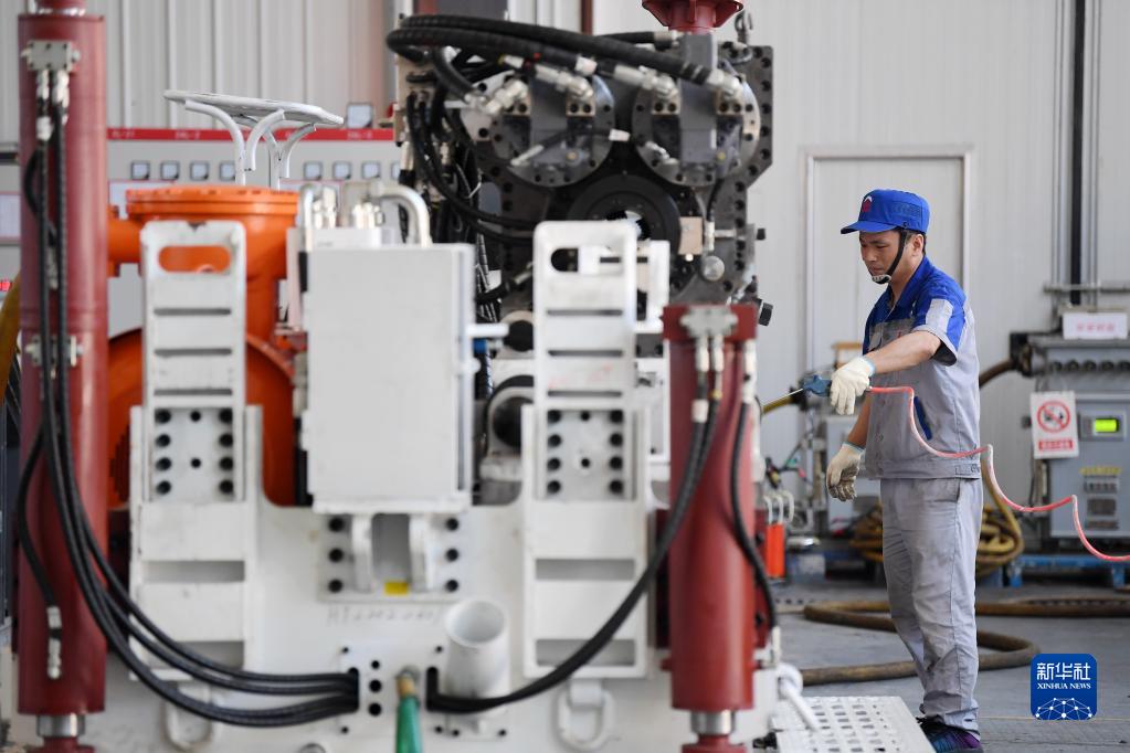 在位于秦創(chuàng)原總窗口所在地陜西省西咸新區(qū)的陜西太合智能鉆探有限公司,工人準備對智能定向鉆機進行性能調(diào)試(2022年6月17日攝)。新華社記者 李一博 攝
