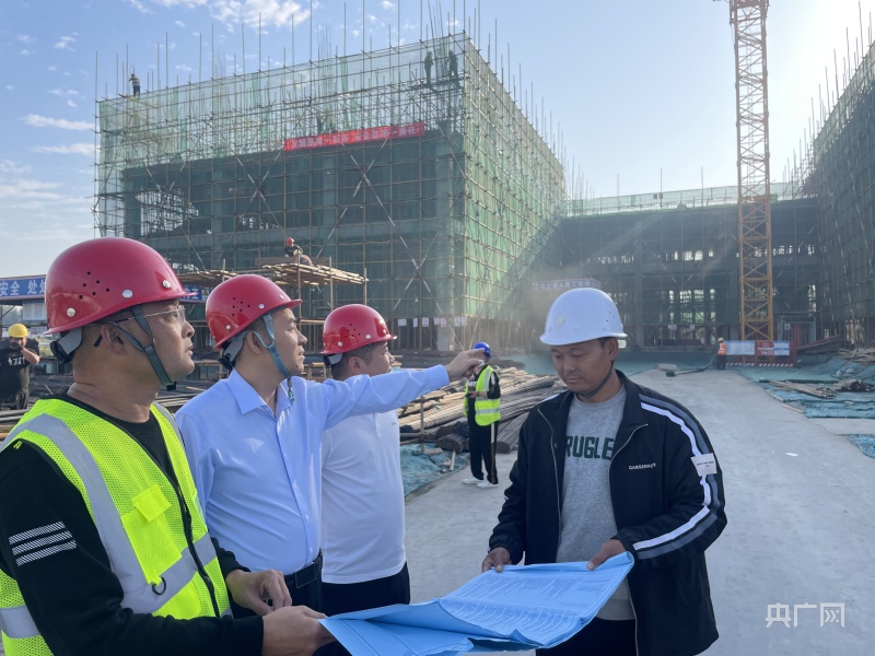 張留民(左二)在電源器件生產(chǎn)項(xiàng)目建設(shè)現(xiàn)場(chǎng)(央廣網(wǎng)發(fā) 殷吉星 攝)