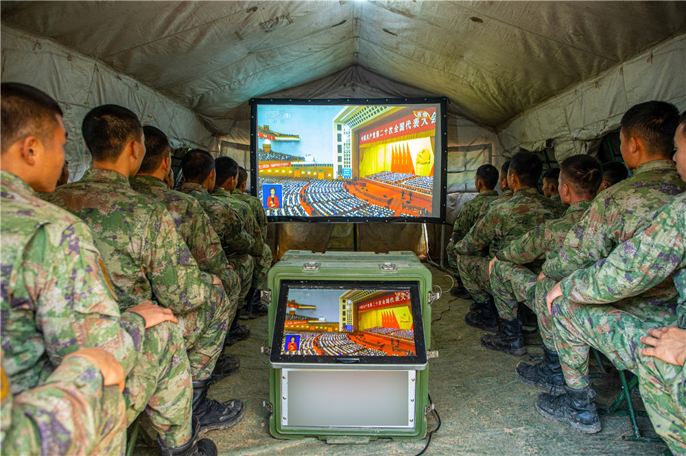10月16日,中部戰(zhàn)區(qū)陸軍第82集團(tuán)軍某旅官兵收看中國共產(chǎn)黨第二十次全國代表大會(huì)開幕會(huì)。新華社發(fā)(徐超 攝)