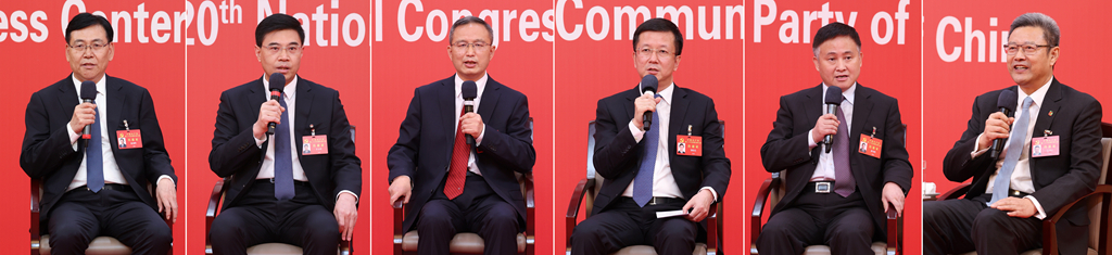 10月20日,中國(guó)共產(chǎn)黨第二十次全國(guó)代表大會(huì)新聞中心舉行集體采訪。青海、寧夏、新疆、中央和國(guó)家機(jī)關(guān)、中央金融系統(tǒng)、中央企業(yè)系統(tǒng)(在京)代表團(tuán)新聞發(fā)言人出席,介紹代表團(tuán)學(xué)習(xí)討論二十大報(bào)告情況,并回答記者提問(拼版照片)。新華社記者 張玉薇 攝