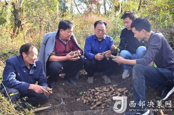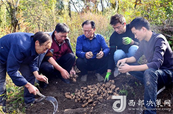 10月18日,寧強縣陽平關(guān)鎮(zhèn)伍家壩村第一書記唐賢斌(右三)正在天麻基地查看天麻的收成等情況。