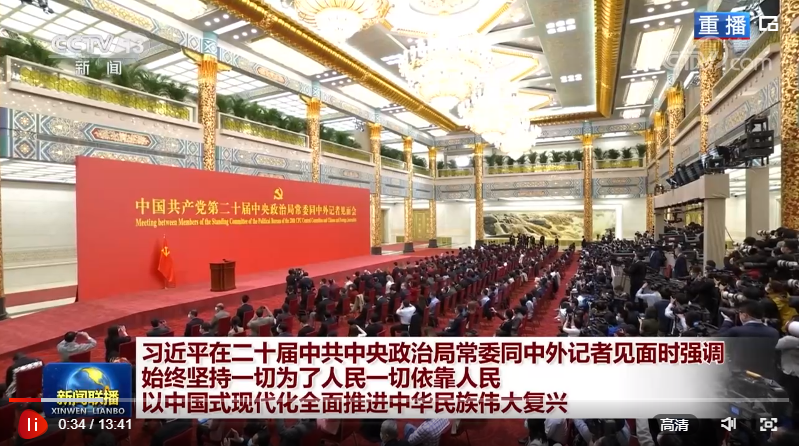 剛剛在中國共產(chǎn)黨第二十屆中央委員會第一次全體會議上當(dāng)選的中共中央總書記習(xí)近平和中共中央政治局常委李強、趙樂際、王滬寧、蔡奇、丁薛祥、李希,23日中午在人民大會堂同采訪中共二十大的中外記者親切見面。