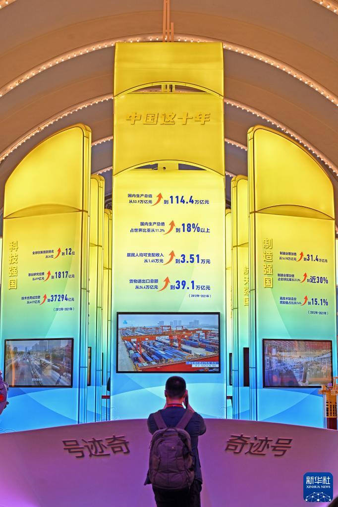 觀眾在“奮進(jìn)新時(shí)代”主題成就展中央綜合展區(qū)內(nèi)拍攝中國經(jīng)濟(jì)“奇跡號”巨輪模型(2022年10月8日攝)。新華社記者 李鑫 攝