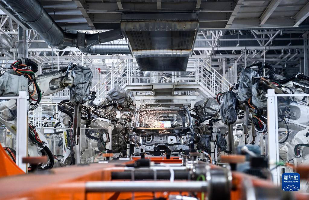10月17日,在吉林長春中國第一汽車集團有限公司紅旗繁榮工廠焊裝車間內(nèi),焊裝機器人在生產(chǎn)線上焊接車身。新華社記者 顏麟蘊 攝