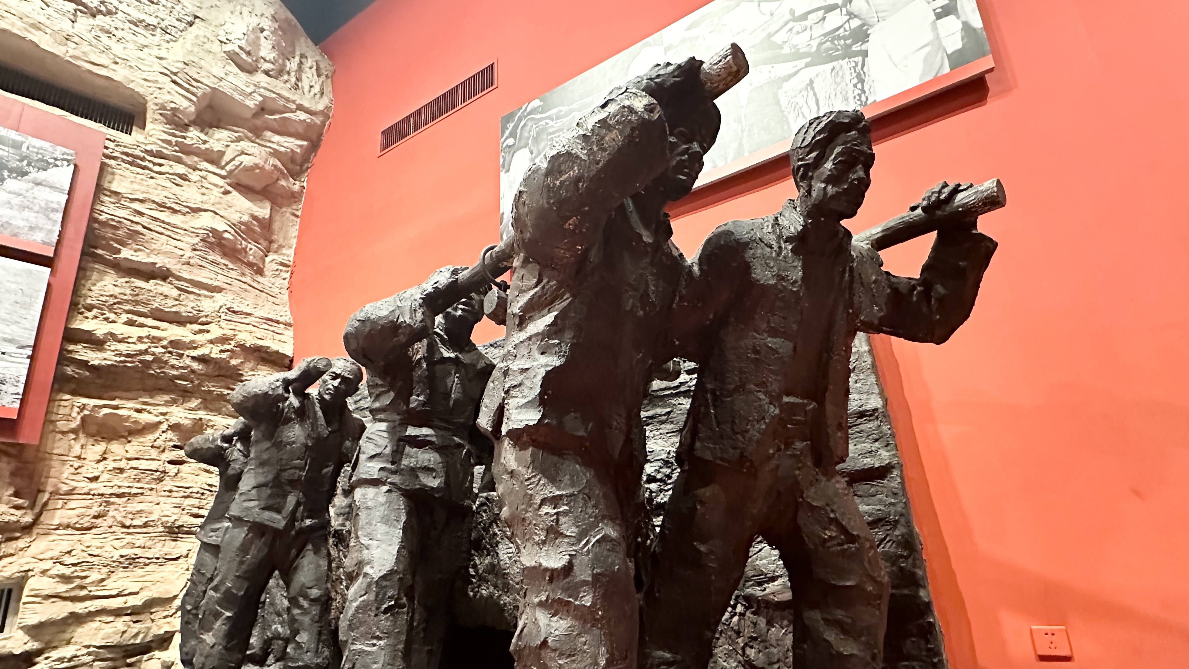 △紅旗渠紀(jì)念館,重現(xiàn)當(dāng)年修建場(chǎng)景的雕塑。(總臺(tái)央視記者范一鳴拍攝)