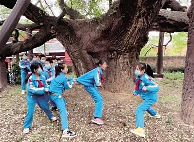 放學(xué)鈴聲響起,同學(xué)們排著隊(duì),有序從學(xué)校走出。“這棵古樹(shù),到了夏天,伸展出的枝葉,可以覆蓋大部分校園,同學(xué)們?cè)诖髽?shù)的懷抱下,避開(kāi)烈日,享受課間自由活動(dòng)時(shí)間。”李以萱說(shuō)著,召喚12名同學(xué),大家手拉手環(huán)繞在“護(hù)王槐”主干周?chē)?,玩起了老鷹捉小雞,唱著《上學(xué)歌》。