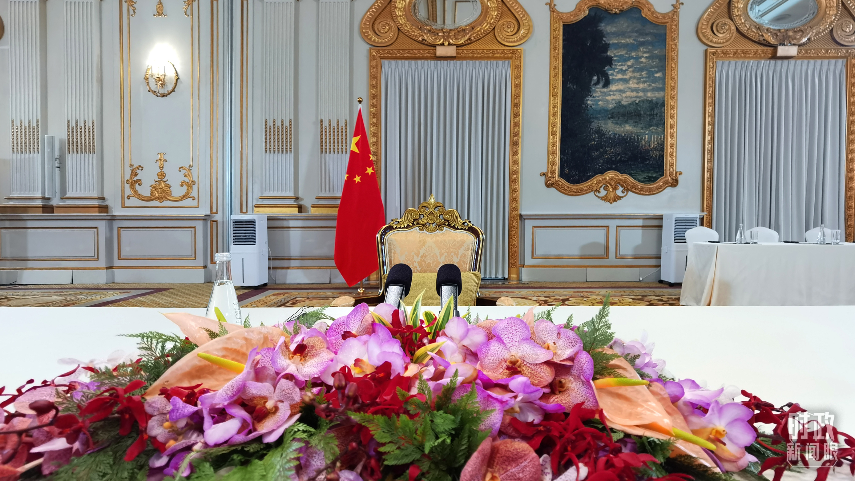 △會見現(xiàn)場的中智兩國國旗。(總臺央廣記者劉會民拍攝)
