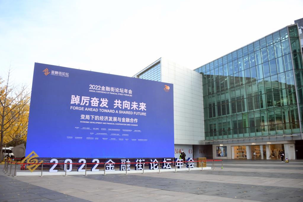 11月21日在北京金融大街附近拍攝的2022金融街論壇年會標(biāo)識。新華社記者 任超 攝