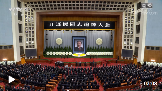 12月6日上午10時,黨中央、全國人大常委會、國務院、全國政協、中央軍委在北京人民大會堂隆重舉行江澤民同志追悼大會。