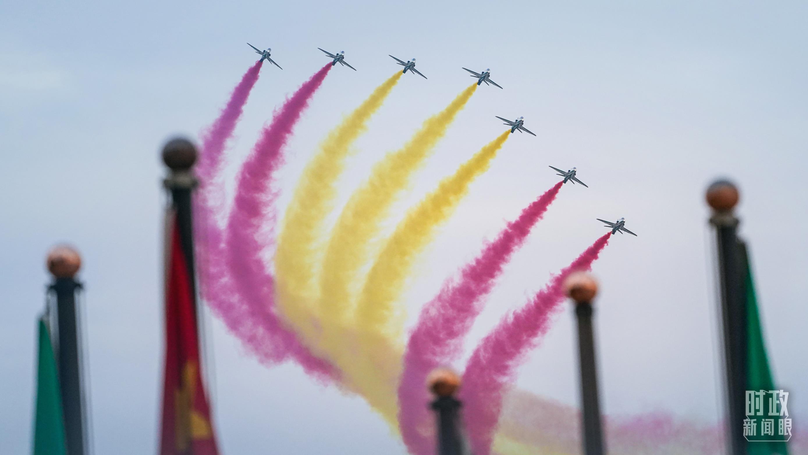 △沙特禮賓護(hù)衛(wèi)機(jī)在空中拉出象征中國(guó)國(guó)旗的紅黃兩色彩帶。(總臺(tái)國(guó)廣記者李晉拍攝)