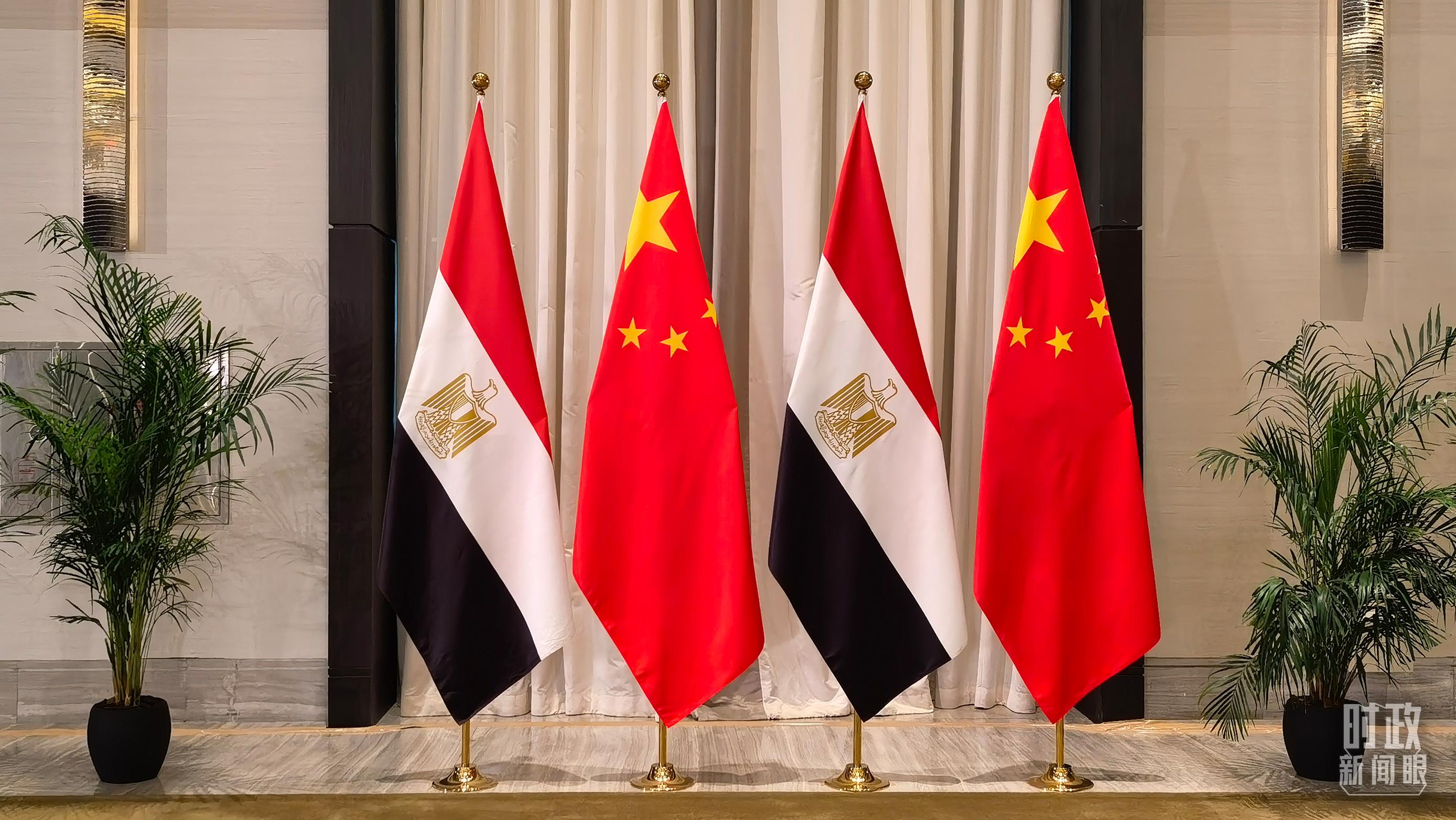 △會(huì)見(jiàn)現(xiàn)場(chǎng)的中埃兩國(guó)國(guó)旗。(總臺(tái)央視記者韓銳拍攝)