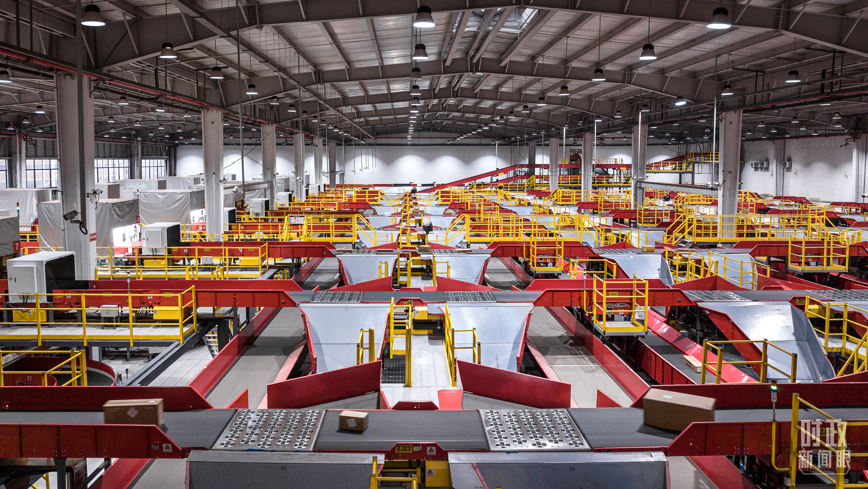 △浙江金華的快遞物流轉(zhuǎn)運中心采用自動流水線分揀機器人。(圖/視覺中國)