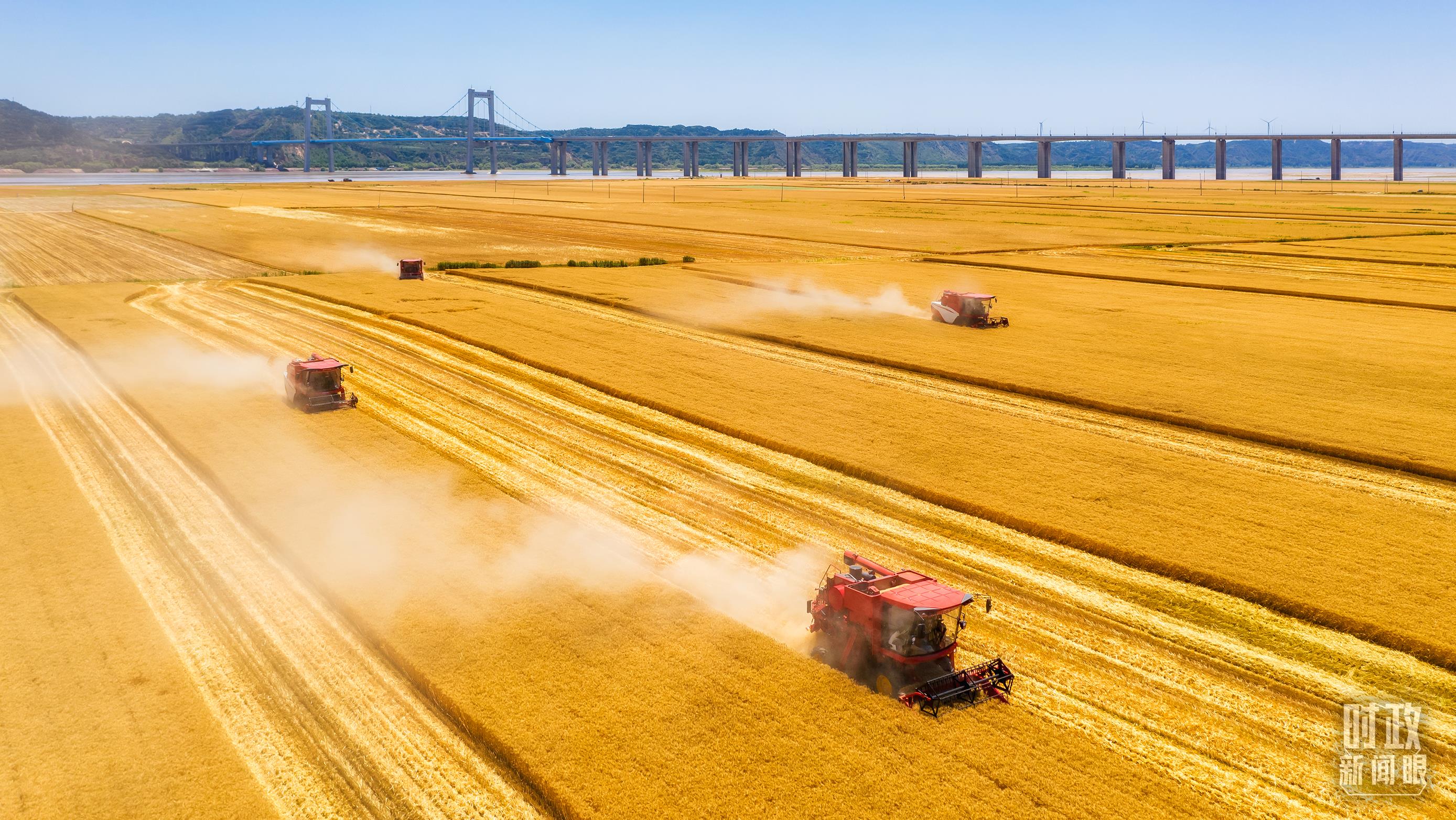 △位于河南省黃河河畔的麥田成熟,聯(lián)合收割機(jī)正在收割作業(yè)。(圖/視覺中國)