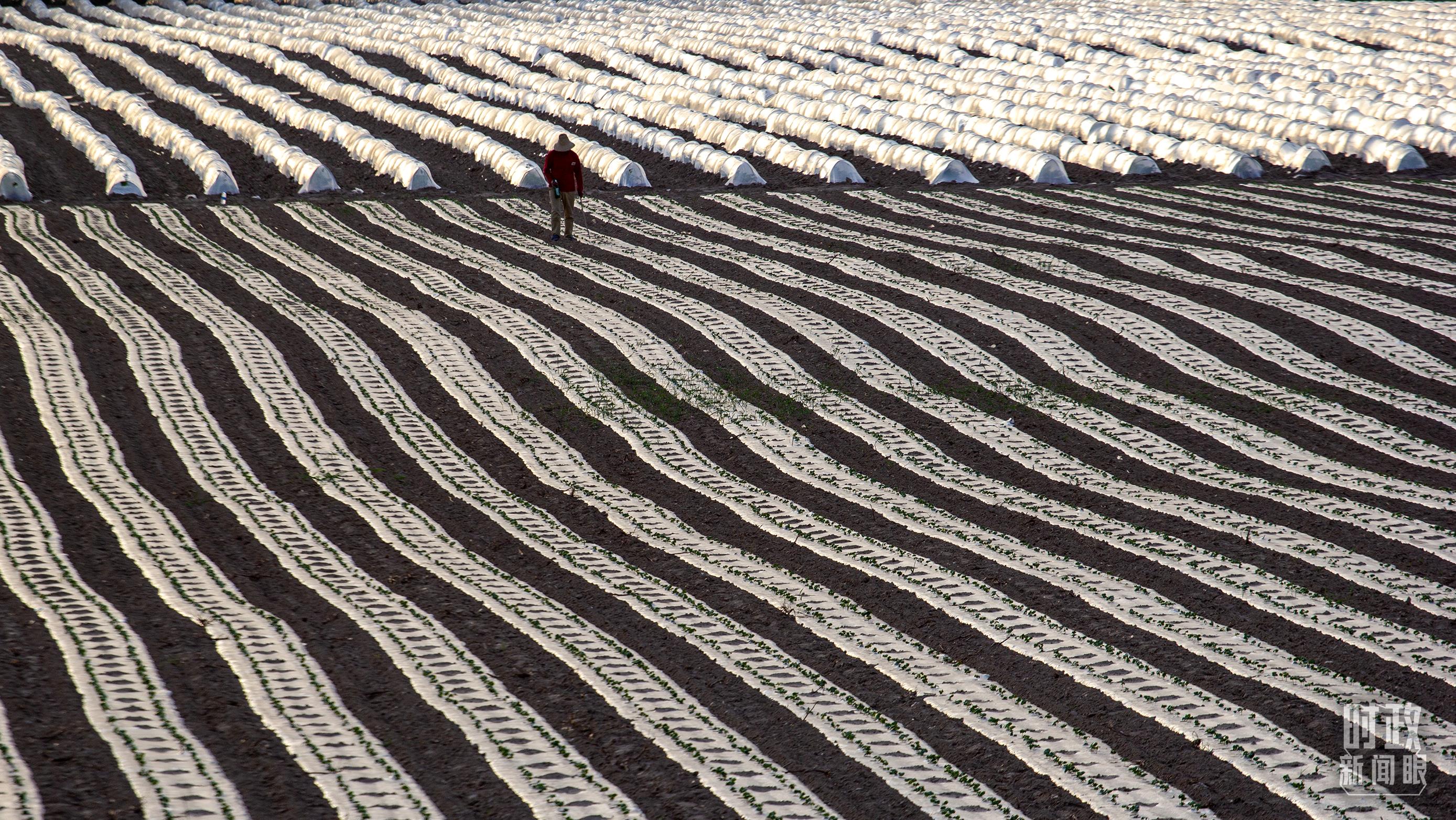 △山西省運(yùn)城市農(nóng)民在田間覆膜播種西瓜。(圖/視覺中國)