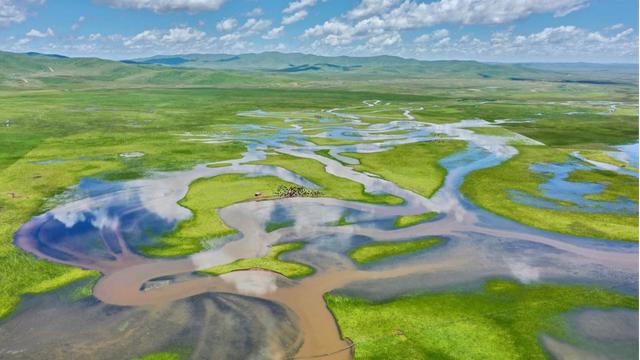 濕地河水充盈,草木豐美。時(shí)卷時(shí)舒的層云將陰影投在大自然鬼斧神工造就的草原上,成群的牛羊、鹿群以及盤旋高空的蒼鷹,還有珍稀動(dòng)物