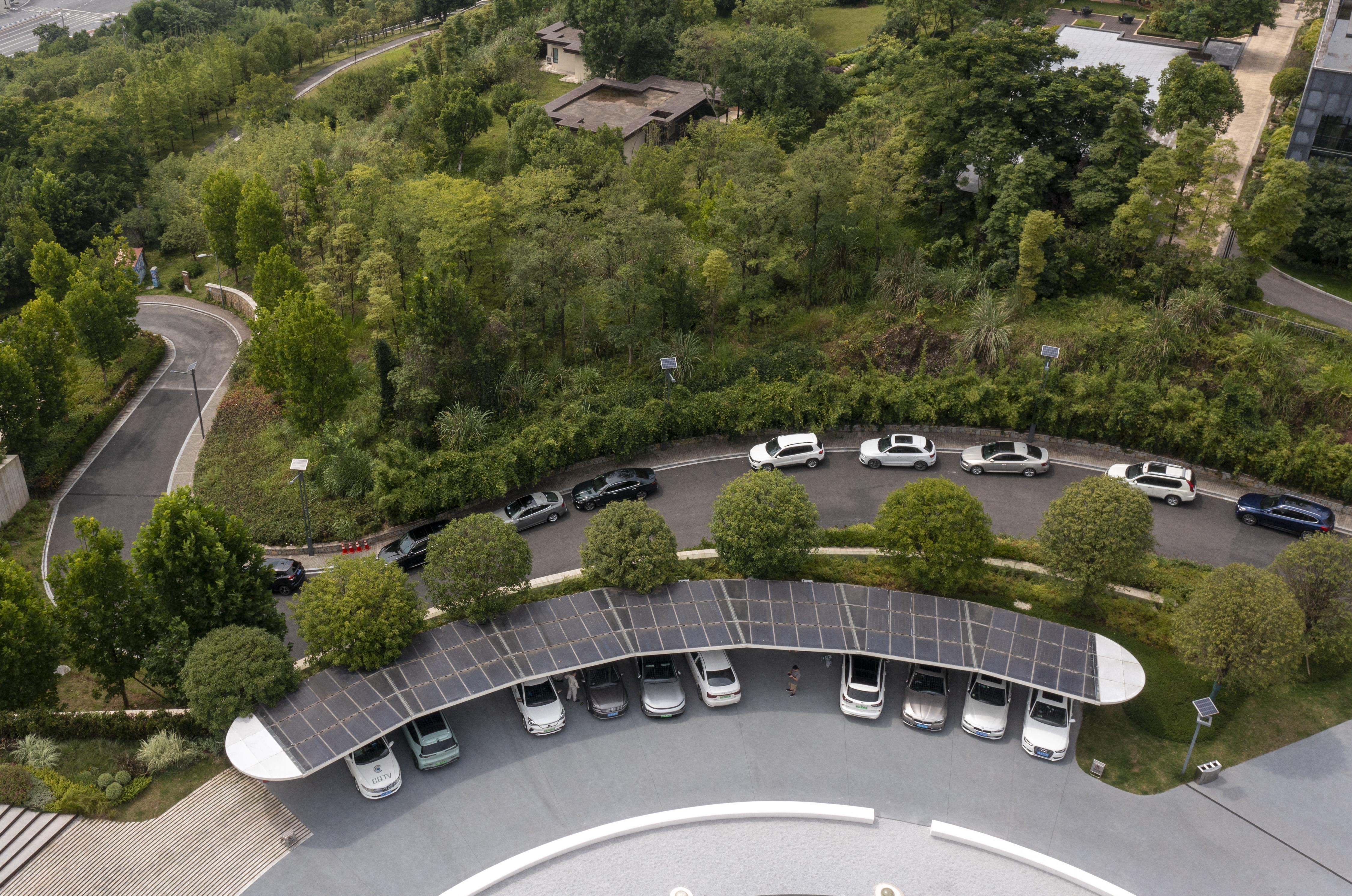 2022年6月16日拍攝的已建成投用的重慶首座光伏充電發(fā)用一體充電站(無(wú)人機(jī)照片)。新華社記者 劉潺 攝