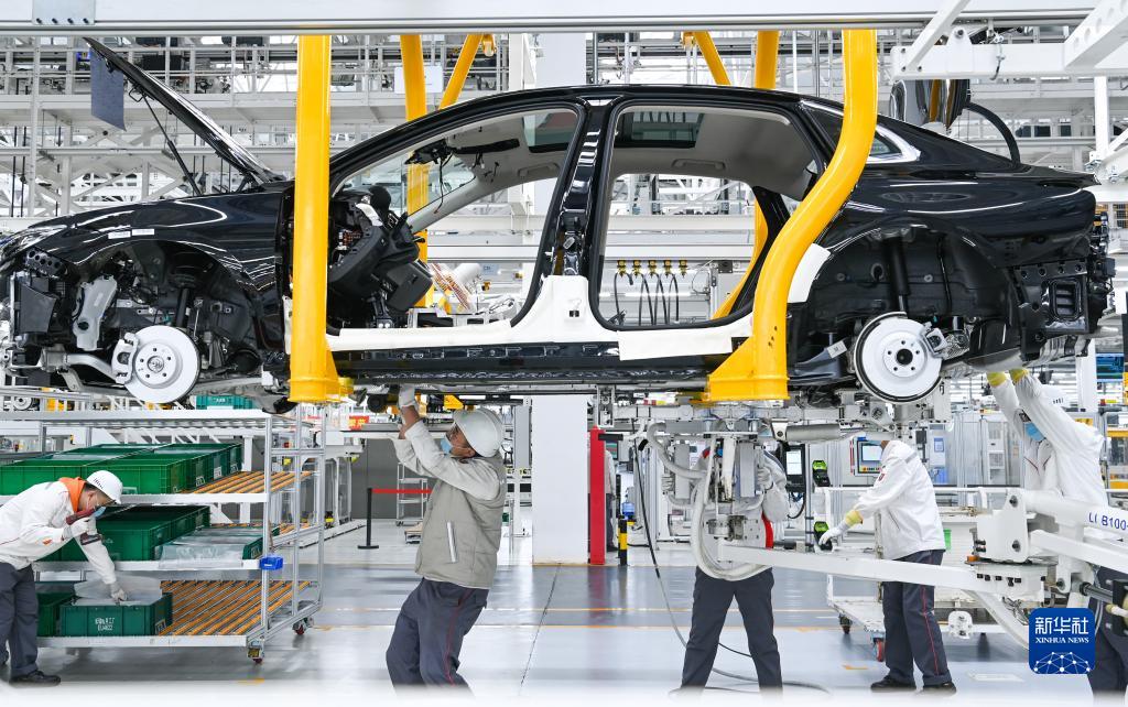 在吉林省長春市中國第一汽車集團有限公司紅旗繁榮工廠,工人在總裝車間的生產(chǎn)線上裝配車輛(2022年10月17日攝)。新華社記者 顏麟蘊 攝