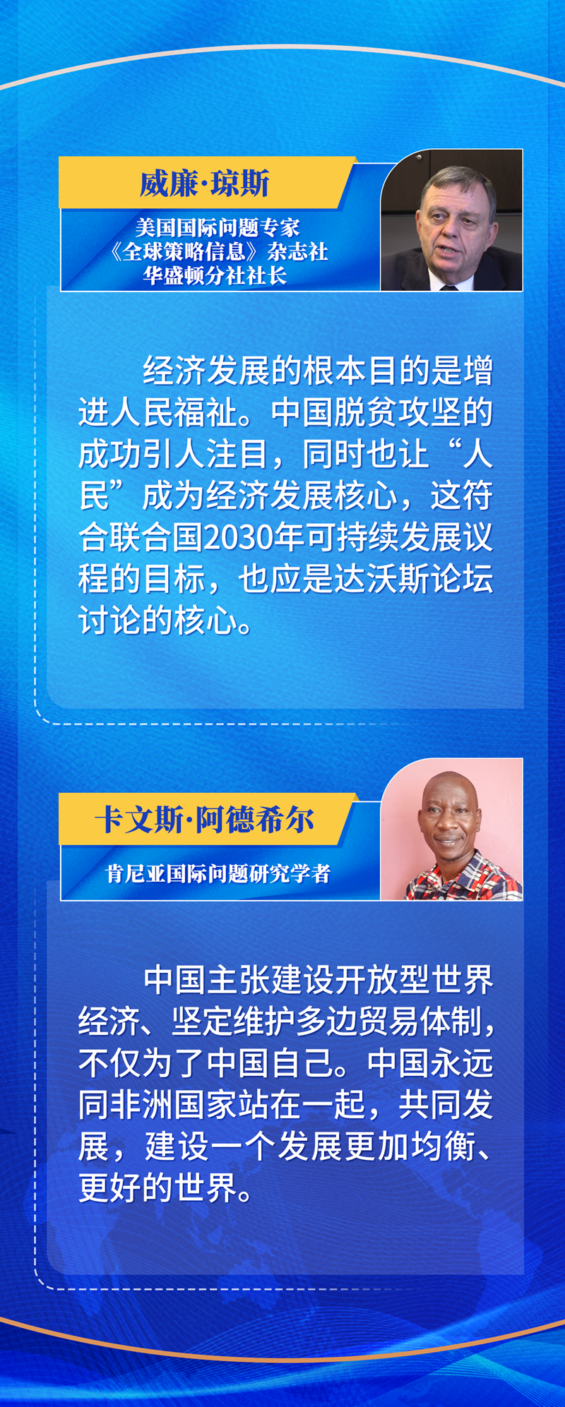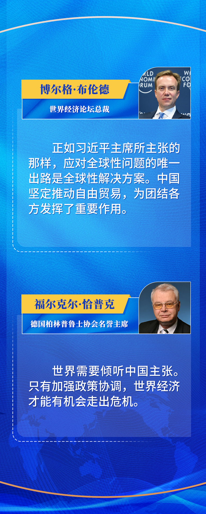 今年的達(dá)沃斯論壇年會(huì)以“在分裂的世界中加強(qiáng)合作”為主題。對(duì)習(xí)近平主席的主張,世界經(jīng)濟(jì)論壇總裁博爾格·布倫德深表認(rèn)同。他說,應(yīng)對(duì)全球性問題的出路是全球性解決方案。“中國堅(jiān)定推動(dòng)自由貿(mào)易,為團(tuán)結(jié)各方發(fā)揮了重要作用。”