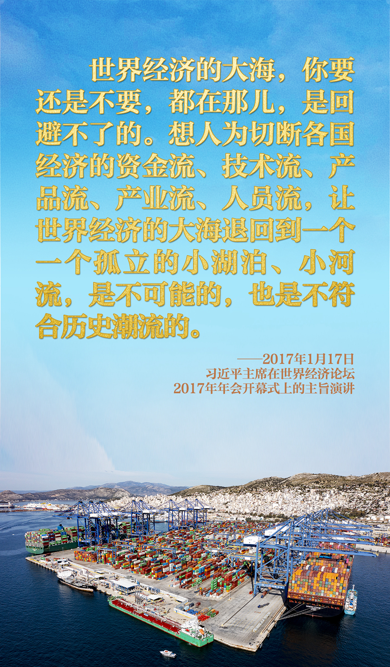 經(jīng)濟(jì)全球化何去何從?習(xí)近平主席在達(dá)沃斯論壇上作出明確回答:“世界經(jīng)濟(jì)的大海,你要還是不要,都在那兒,是回避不了的。想人為切斷各國經(jīng)濟(jì)的資金流、技術(shù)流、產(chǎn)品流、產(chǎn)業(yè)流、人員流,讓世界經(jīng)濟(jì)的大海退回到一個(gè)一個(gè)孤立的小湖泊、小河流,是不可能的,也是不符合歷史潮流的。”