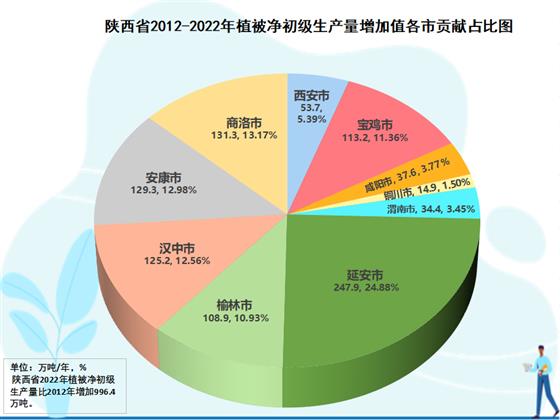 2012-2022年分市元生產(chǎn)量增長(zhǎng)貢獻(xiàn)分析結(jié)果表明,各市對(duì)全省生態(tài)蛋糕增長(zhǎng)均有所貢獻(xiàn),但各市的貢獻(xiàn)大小差異很大,在生態(tài)蛋糕中的地位也隨之有所變化。全國(guó)退耕還林策源地美稱的延安是全省生態(tài)蛋糕增量最大的市,10年增加247.9萬噸,為全省生態(tài)蛋糕增加量貢獻(xiàn)了24.9個(gè)百分點(diǎn)。商洛第二,10年增加131.3萬噸,為全省貢獻(xiàn)13.2個(gè)百分點(diǎn)。安康第三,10年增加129.3萬噸,為全省貢獻(xiàn)13.0個(gè)百分點(diǎn)。漢中第四,增加125.2萬噸,為全省貢獻(xiàn)12.6個(gè)百分點(diǎn)。其后,依次分別是寶雞增加113.2萬噸、為全省貢獻(xiàn)11.4%,榆林增加108.9萬噸、為全省貢獻(xiàn)10.9%,西安增加53.7萬噸、為全省貢獻(xiàn)5.4%,咸陽(yáng)增加37.6萬噸、為全省貢獻(xiàn)3.8%,渭南增加34.4萬噸、為全省貢獻(xiàn)3.4%,銅川增加24.9萬噸、為全省貢獻(xiàn)1.5%。