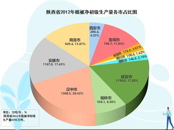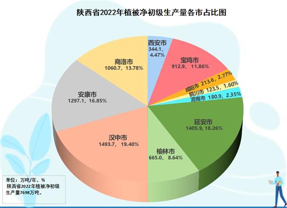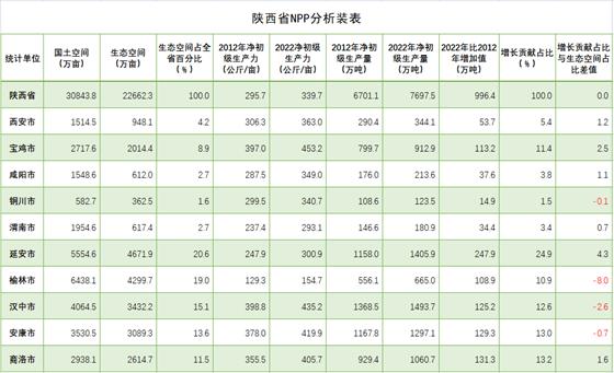 全省元生產(chǎn)力區(qū)域分析結(jié)果表明,在三大區(qū)域生態(tài)蛋糕越來越大的同時(shí),生態(tài)蛋糕的空間布局上與結(jié)構(gòu)發(fā)生變化,呈現(xiàn)黃河流域綠色崛起大趨勢(shì)。陜北榆林、延安兩市,生態(tài)空間8971.6萬畝,占全省的39.6%;關(guān)中西安、寶雞、咸陽(yáng)、渭南、銅川五市生態(tài)空間4554.5萬畝,占全省的29.2%;陜南漢中、安康、商洛三市生態(tài)空間9136.2萬畝,占全省的40.2%。2022年,陜北兩市提供了2070.9萬噸植被凈初級(jí)生產(chǎn)量,占全省的26.9%,比2012年的1714.1萬噸增加313.8萬噸,增長(zhǎng)18.3%,在全省份額上升了1.3個(gè)百分點(diǎn);關(guān)中五市提供了1775.1萬噸的植被凈初級(jí)生產(chǎn)量,占全省的23.1%,比2012年的1524.3萬噸250.8萬噸,增長(zhǎng)16.4%,在全省份額上升了0.3個(gè)百分點(diǎn);陜南三市提供了3851.5萬噸植被凈初級(jí)生產(chǎn)量,占全省的50.0%,比2012年的3462.7萬噸增加388.8萬噸,增長(zhǎng)11.2%,在全省份額下降了1.6個(gè)百分點(diǎn)。2012-2022年全省新增生態(tài)蛋糕996.4萬噸,陜北兩市貢獻(xiàn)31.5%,關(guān)中五市貢獻(xiàn)29.5%,陜南三市貢獻(xiàn)39.0%。陜北、關(guān)中提供的生態(tài)蛋糕占全省的份額已由2012年的48.4%提高到2022年的50.0%。