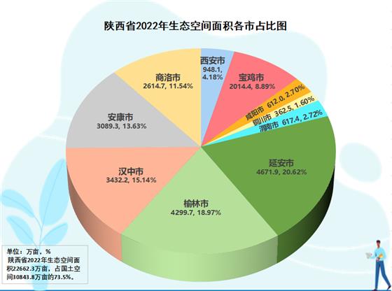 陜西南部秦巴山脈、北部黃土高原、中部渭河川地,自然生態(tài)空間多、占比大。陜西省生態(tài)空間數(shù)據(jù)中心提供的數(shù)據(jù)顯示,全省國(guó)土空間3.08億畝,其中生態(tài)空間(林地、草地、濕地、荒野)2.26億畝。從全省10市生態(tài)空間大格局分析觀察,黃土高原腹地的延安是全省生態(tài)空間第一市,生態(tài)空間4671.9萬畝、占本市國(guó)土空間84.1%、占全省生態(tài)空間20.6%。長(zhǎng)城內(nèi)外、林草過度的榆林居第二,生態(tài)空間4299.7萬畝、占本市國(guó)土空間66.8%、占全省生態(tài)空間19.0%。第三是漢中,生態(tài)空間3432.2萬畝、占本市國(guó)土空間84.4%、占全省生態(tài)空間15.1%。第四是安康,生態(tài)空間3089.3萬畝、占本市國(guó)土空間87.5%、占全省生態(tài)空間13.6%。其后,依次分別是商洛,生態(tài)空間2614.7萬畝、占本市國(guó)土空間90.0%、占全省生態(tài)空間11.5%,寶雞2014.4萬畝、占本市74.1%、占全省8.9%,西安948.1萬畝、占本市62.6%、占全省4.2%,渭南617.4萬畝、占本市31.5%、占全省2.7%,咸陽(yáng)612萬畝、占本市39.5%、占全省2.7%,銅川362.5萬畝、占本市62.2%、占全省1.6%。