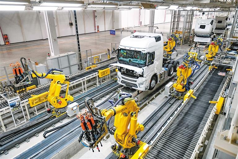 陜汽重卡擴能項目總裝生產(chǎn)線,工業(yè)機器人正在進行自動化裝配作業(yè)。(資料照片) 記者 竇翊明 攝