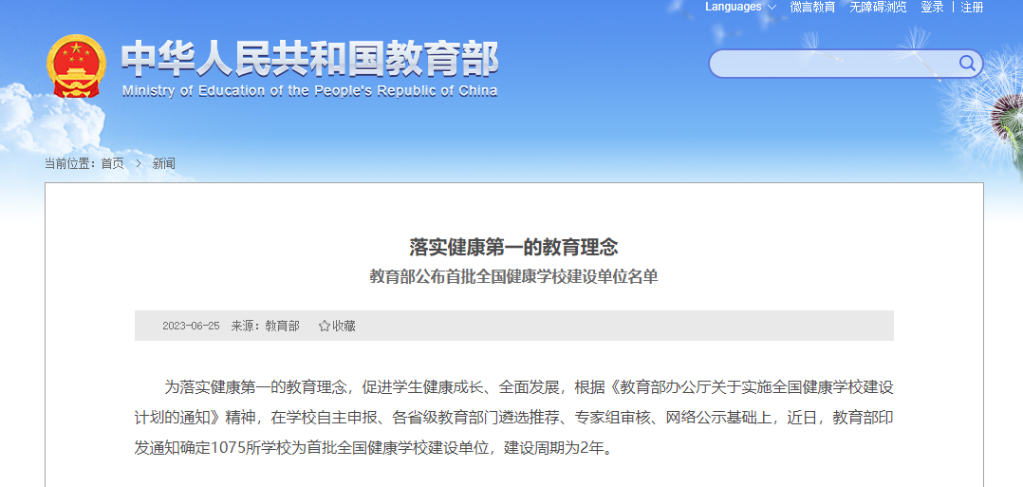 記者6月25日從教育部獲悉,為落實(shí)健康第一的教育理念,促進(jìn)學(xué)生健康成長、全面發(fā)展,在學(xué)校自主申報(bào)、各省級教育部門遴選推薦、專家組審核、網(wǎng)絡(luò)公示基礎(chǔ)上,教育部近日印發(fā)通知,確定1075所學(xué)校為首批全國健康學(xué)校建設(shè)單位,建設(shè)周期為2年。