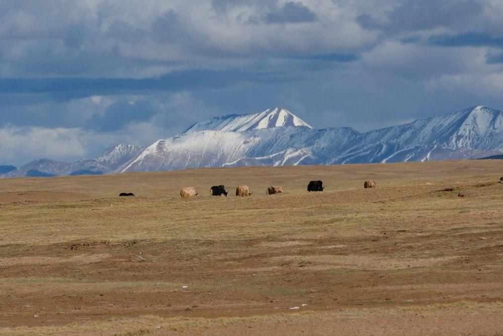 6月14日,在長(zhǎng)江源地區(qū)的沱沱河附近,一群牦牛在覓食。