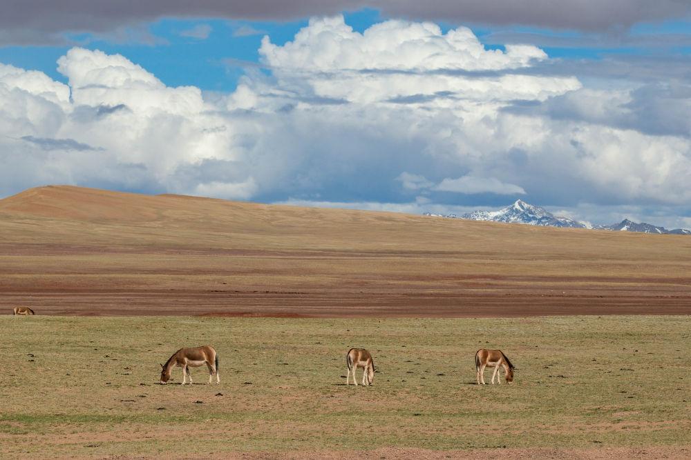 6月15日,在長(zhǎng)江源地區(qū)的楚瑪爾河附近,幾只藏野驢在覓食。