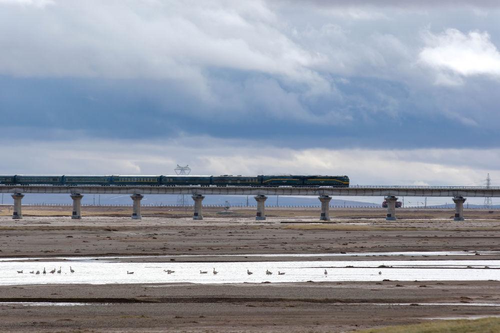 6月15日,一列火車駛過長(zhǎng)江源地區(qū)的沱沱河。
