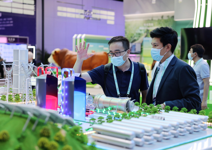 5月26日,觀眾在在中關(guān)村國(guó)家自主創(chuàng)新示范區(qū)展示中心了解100MW先進(jìn)壓縮空氣儲(chǔ)能技術(shù)。新華社記者 張晨霖 攝