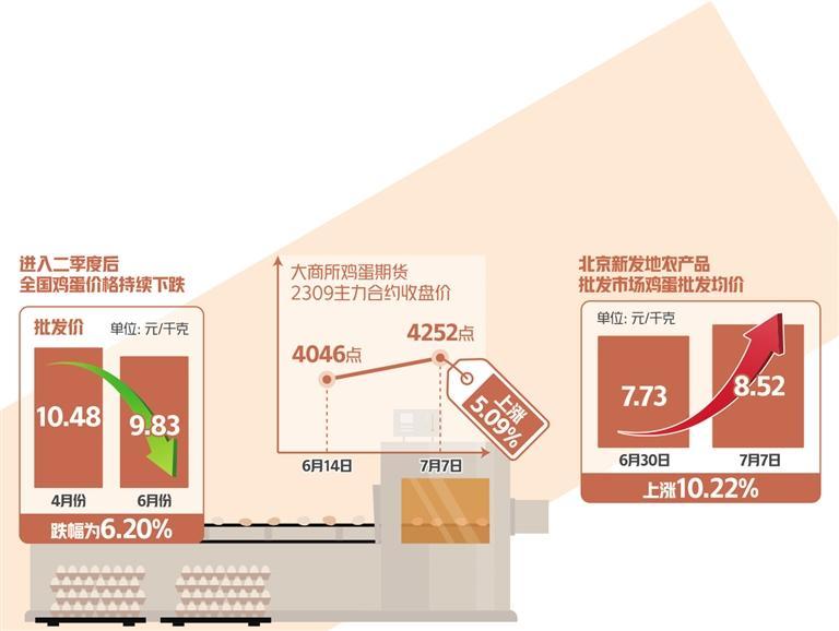 7月7日,大商所雞蛋期貨2309主力合約以4252點(diǎn)報(bào)收,比6月14日收盤4046點(diǎn)上漲5.09%。一些地方雞蛋現(xiàn)貨價(jià)格也顯著反彈。7日,北京新發(fā)地農(nóng)產(chǎn)品批發(fā)市場(chǎng)雞蛋批發(fā)均價(jià)為8.52元/千克,比上周同期(6月30日)的7.73元/千克上漲10.22%。“本周蛋價(jià)快速反彈不具有可持續(xù)性,僅是正常波動(dòng)。當(dāng)前雞蛋供應(yīng)仍然充足,沒有出現(xiàn)供不應(yīng)求的狀況。”北京新發(fā)地農(nóng)產(chǎn)品批發(fā)市場(chǎng)統(tǒng)計(jì)部經(jīng)理劉通介紹。
