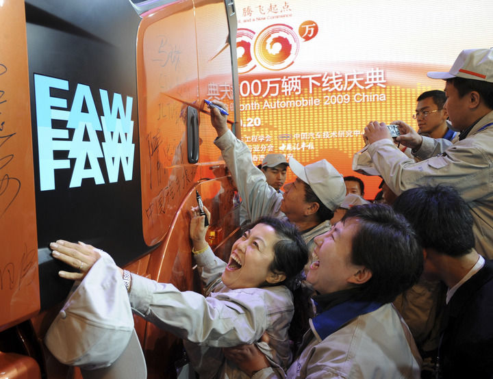 2009年10月20日,一汽解放的工人們在自己親手生產(chǎn)的2009年中國第1000萬輛車上簽名。新華社記者 蔣林 攝