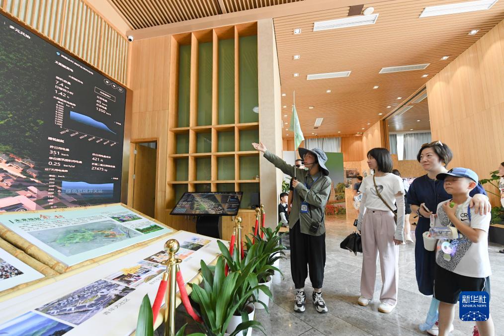 8月11日,游客在安吉余村未來(lái)鄉(xiāng)村展館了解當(dāng)?shù)鼐G色用能情況。