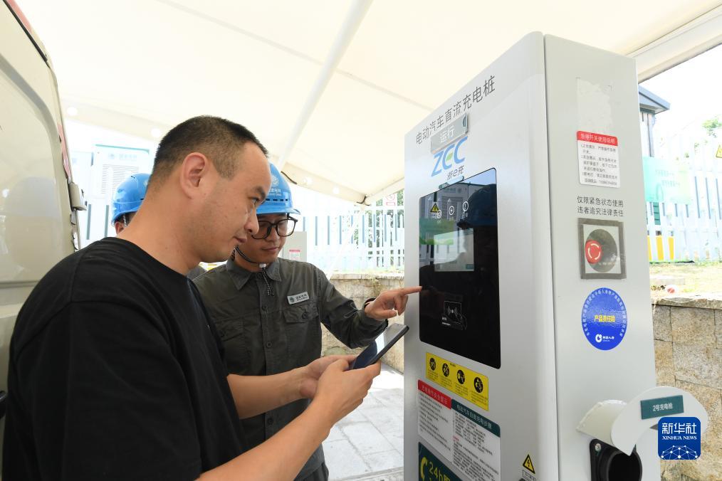 8月11日,游客在安吉余村一處停車場(chǎng)為電動(dòng)車充電。